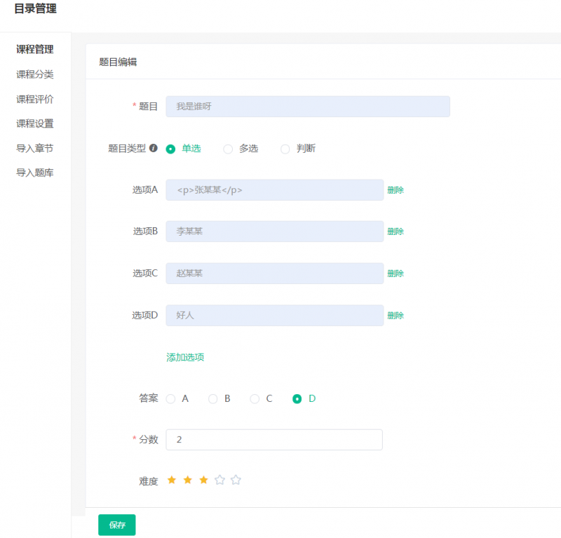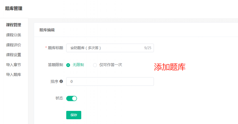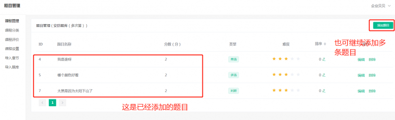 题库添加路径:后台 - 课程 - 某课程 - 更多 - 题库管理可以是单选,多选,判断题,随意混合。每个题都有正确答案,和解析。