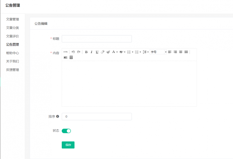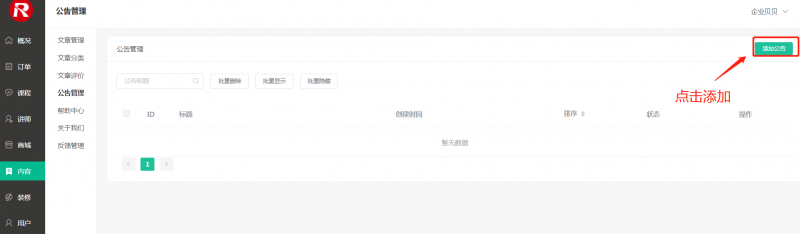 路径:后台 -> 内容 -> 公告管理-> 添加公告