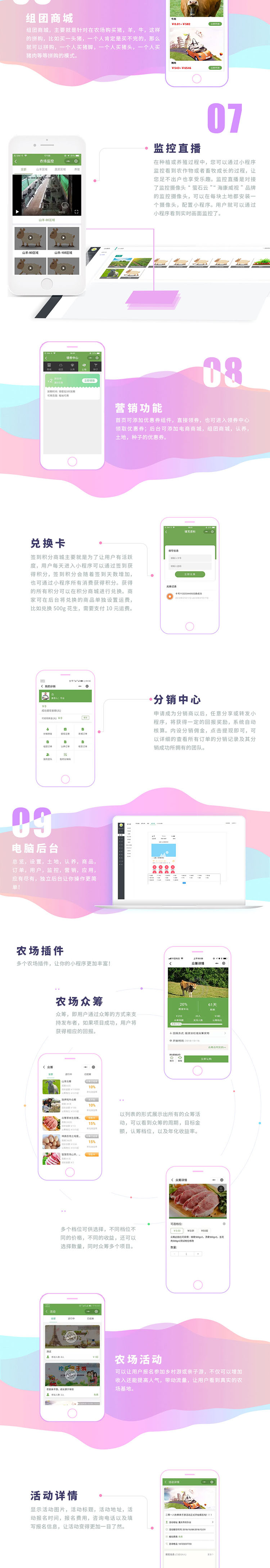 3-12小程序页面:首页、租地、认养、商城、我的、监控、土地详情、认养详情、积分商城、积分商品列表及详情、农场签到、领券中心、商城商品列表及详情、天气、资讯、订单列表及详情、我的土地、背包、我的认养、我的优惠券、组团订单、我的钱包、常见问题、分销中心、关于农场。