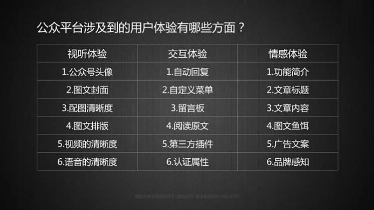 利用用户体验的思路去思考的时候,具体细化到公众号的运营当中,我们就可以找到一条非常清晰的优化路径。并且能够根据三大模块,进一步自我检核,下图我列举了在运营过程中优化的具体内容。